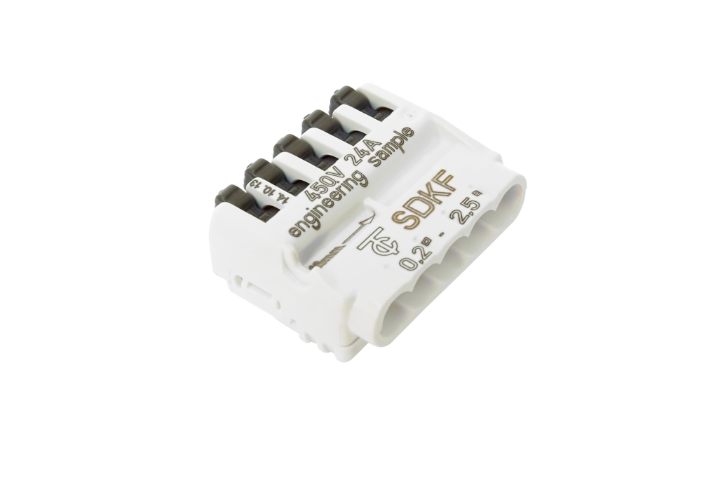 Svorka krabicová páčková SDKF 5 - univerzální (pevný i laněný vodič), bezšroubová, 5x0,2-2,5mm2, bílá.