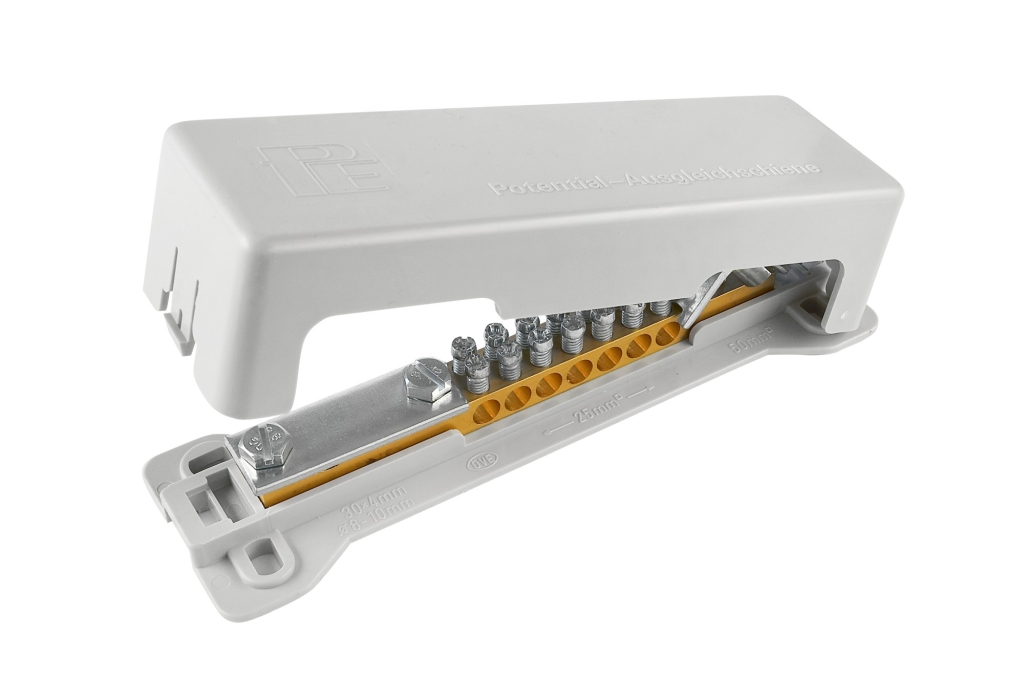 Svorkovnice ekvipotenciální POT 16/25 - krytá svorka, 2-řadá. Připojení páskového zemniče o rozměru 30×4mm, 1x drát 8-10mm, 1x vodič 50mm2, 7x vodič 2,5-25mm2.