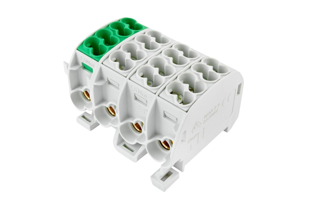 Svorkovnice rozbočovací HLAK 25//4 C 3LPE, 152A, 4pól., IP20, 1000V, 152A, 4-pól, na 1-pól: 2x25mm2, 2x16mm2, CU, na DIN.