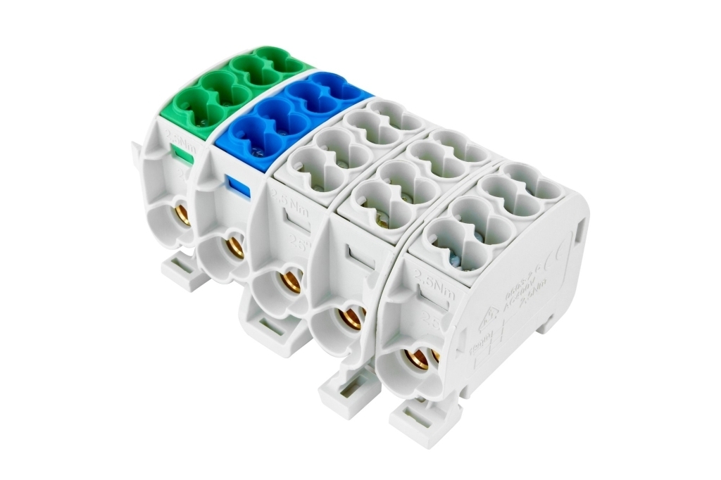 Svorkovnice rozbočovací HLAK 25//5 C 3LNPE, 152A, 5pól., IP20, 1000V, 152A, 5-pólová, na 1 pól: 2x25mm2, 2x16mm2, CU, na DIN.