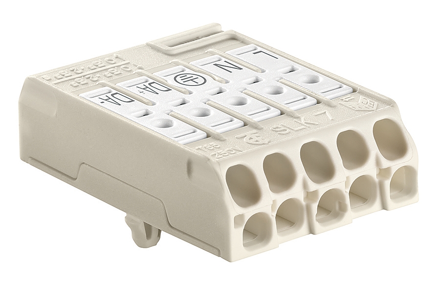 Svorkovnice SLK 7/5 E-SCHR (L-N-E-DA+-DA-) pro svítidla, bezšroubová, PC, bílá /88168390 *1001640 eleman