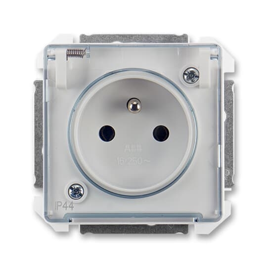 Zásuvka jednonásobná s clonkami a víčkem, s drápky, IP44; bílá (průhledné víčko) Vhodné pro designy z vypínačových řad ABB : G,J Objednací číslo : 5518G-A02989 B1