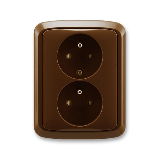 Zásuvka dvojnásobná s ochrannými kolíky, s clonkami; hnědá Vhodné pro designy z vypínačových řad ABB : T Objednací číslo : 5512A-2359 H