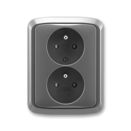 Zásuvka dvojnásobná s ochrannými kolíky, s clonkami; kouřová šedá   Vhodné pro designy z vypínačových řad ABB : T   Objednací číslo : 5512A-2359 S2