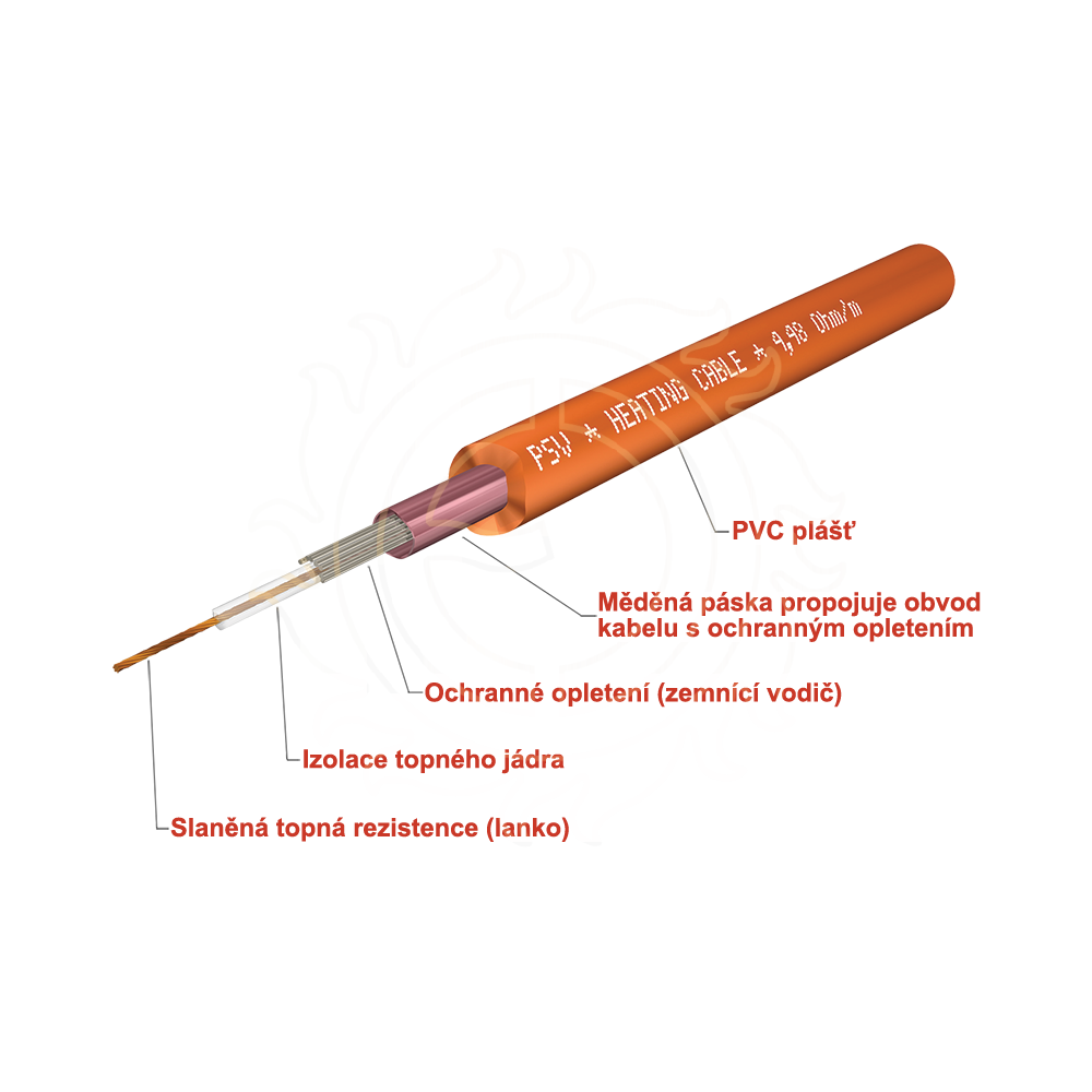 Topný okruh s ochranným opletením pro podlahové vytápění s lineárním příkonem 10 W/m. Kabely PSV jsou z jednožilového kabelu ø5 mm se slaněnou rezistencí (topné jádro je spleteno ze 7 drátků do pevného lanka), takže se vyznačují nadstandardní mechanickou odolností. Okruhy jsou opatřeny dvěma připojovacími vodiči (tzv. Studenými Konci) délky 5 m. Prodloužené SK usnadňují uzavření topného obvodu - s okruhem se stačí vrátit alespoň ke stejné stěně, u které se s pokládkou začalo. Díky ochrannému opletení může být okruh umístěn i do vlhkých prostor (koupelny, prádelny).