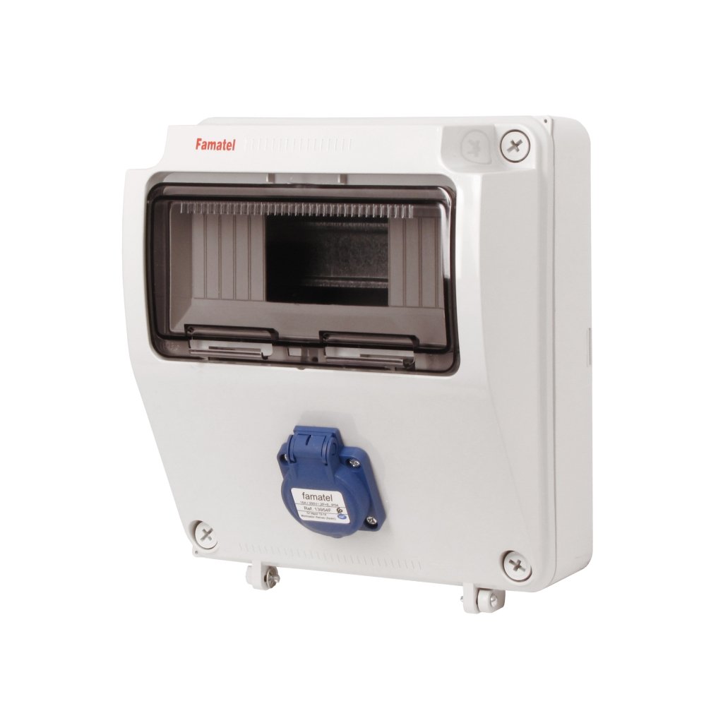 Zásuvková skříň FAMATEL v001 - ZSF10000000.V /3957 IP54 pouze vydrátovaná, zásuvka 1x230V, použité pouzdro: 3957 - 245x215x155mm, barva: světle šedá.