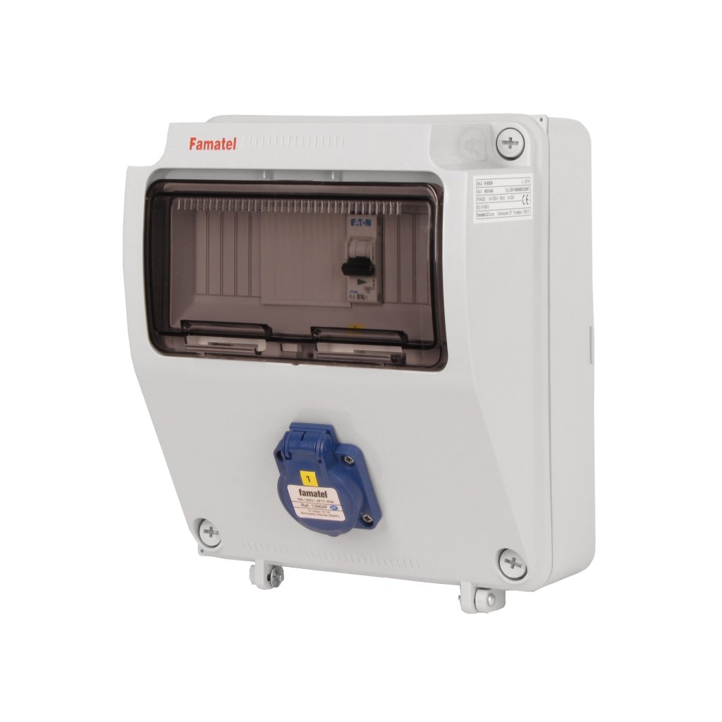 Zásuvková skříň FAMATEL v003-6kA-ZSF10000000.0 /3957 IP54 jištěná bez chrániče, zásuvka 1x230V, přístroje EATON 6kA: 1xPL6-B16/1, použité pouzdro: 3957 - 245x215x155mm, barva: světle šedá.