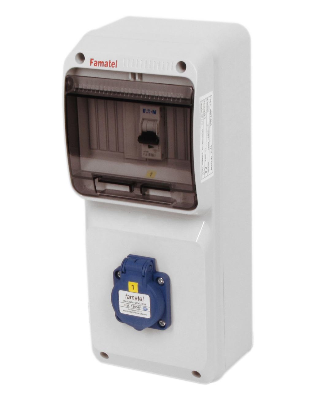 Zásuvková skříň FAMATEL v007-6kA-ZSF10000000.0 /3927 IP54 jištěná bez chrániče, zásuvka 1x230V, přístroje EATON 6kA: 1xPL6-B16/1, použité pouzdro: 3927 - 305x126x107mm, barva: světle šedá.