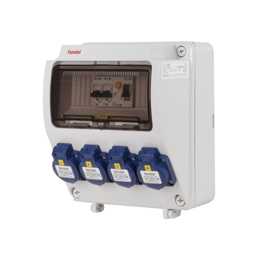 Zásuvková skříň FAMATEL v143-6kA - ZSF40000000.1 /3957  Zás.skříň IP54 jištěná s chráničem 25/2/003, zásuvky 4x230V, přístroje EATON 6kA: 2xPL6-B16/1, PF6-25/2/003, na vstupu, použité pouzdro: 3957 - 245x215x155mm, barva: světle šedá.