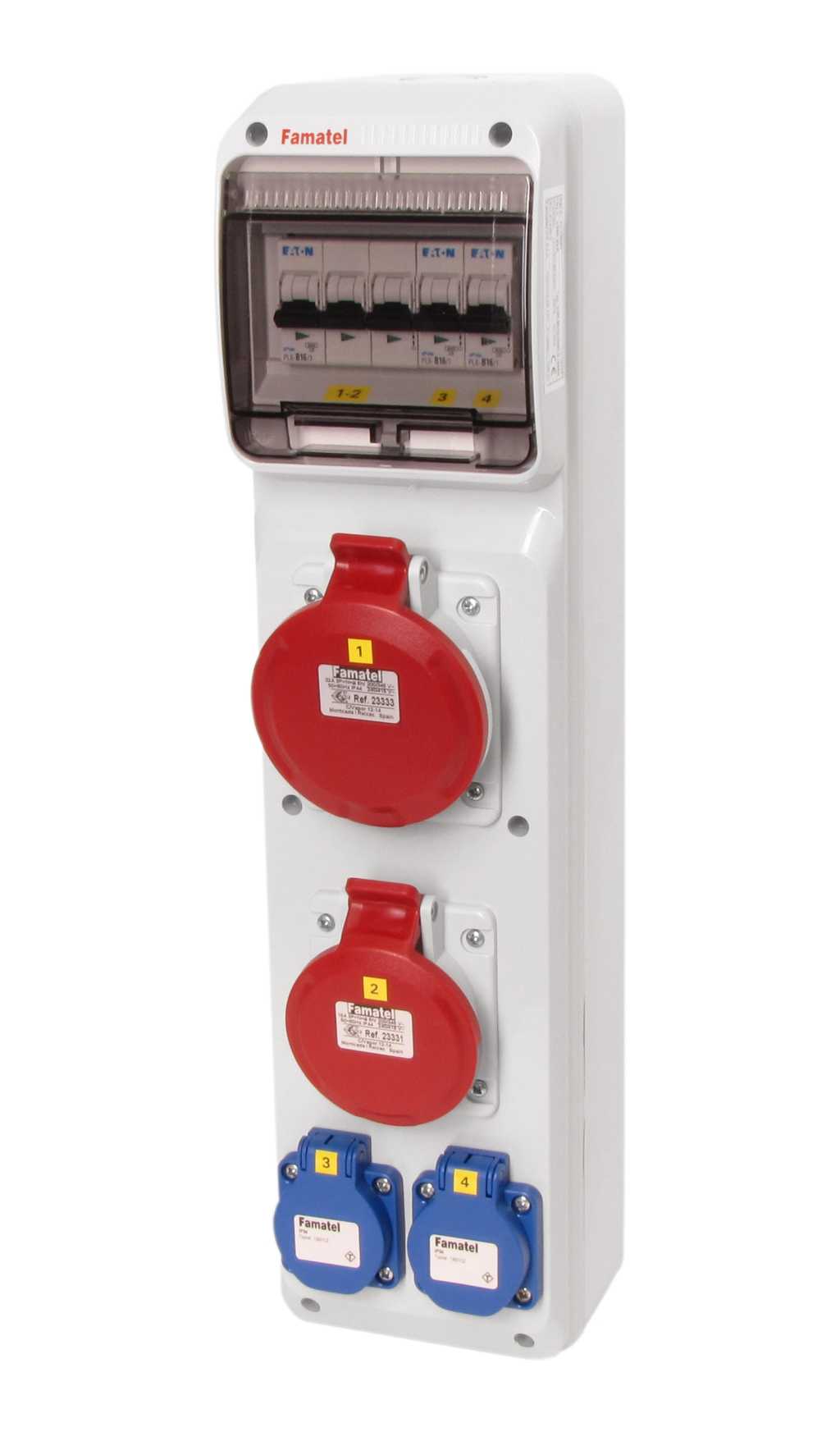 Zásuvková skříň FAMATEL v260-6kA - ZSF20101000.0 /3950 IP44 jištěná bez chrániče, (ekonomická varianta), zásuvky 2x230V, 1x16/5, 1x32/5, přístroje EATON 6kA: 2xPL6-B16/1, 1xPL6-B16/3, použité pouzdro: 3950 - 490x125x107mm, barva: světle šedá.