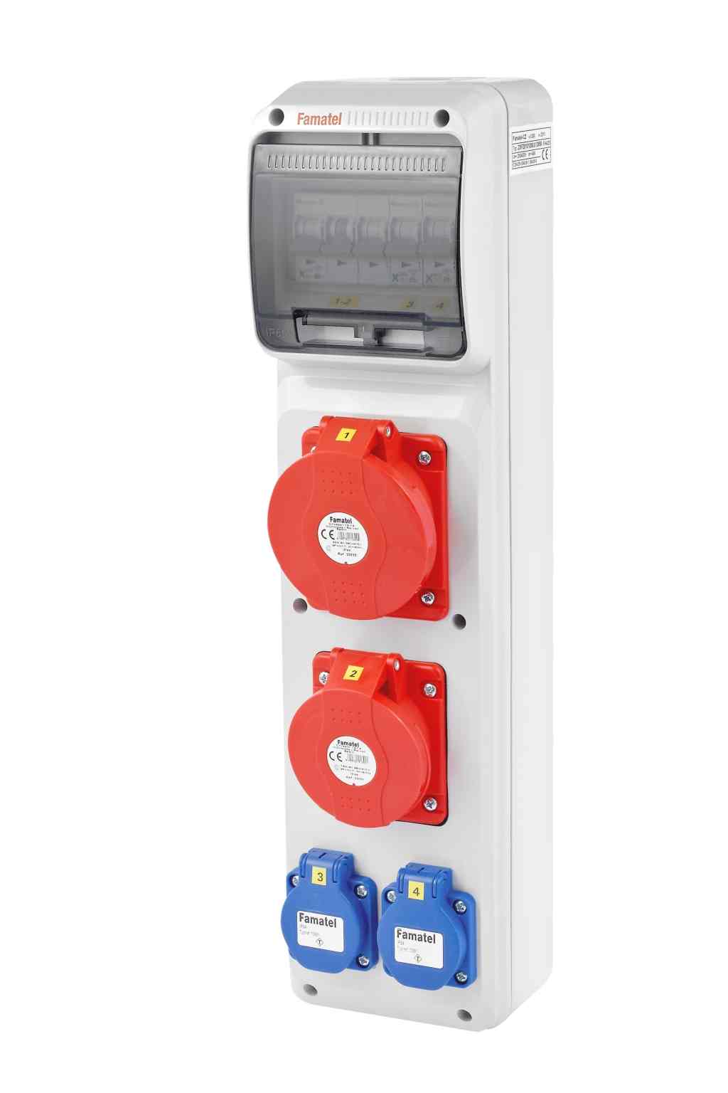 Zásuvková skříň FAMATEL v260 - ZSF20101000.0 /3950 IP44 jištěná bez chrániče, (ekonomická varianta), zásuvky 2x230V, 1x16/5, 1x32/5, přístroje EATON 10kA: 2xPL7-B16/1, 1xPL7-B16/3, použité pouzdro: 3950 - 490x125x107mm, barva: světle šedá.