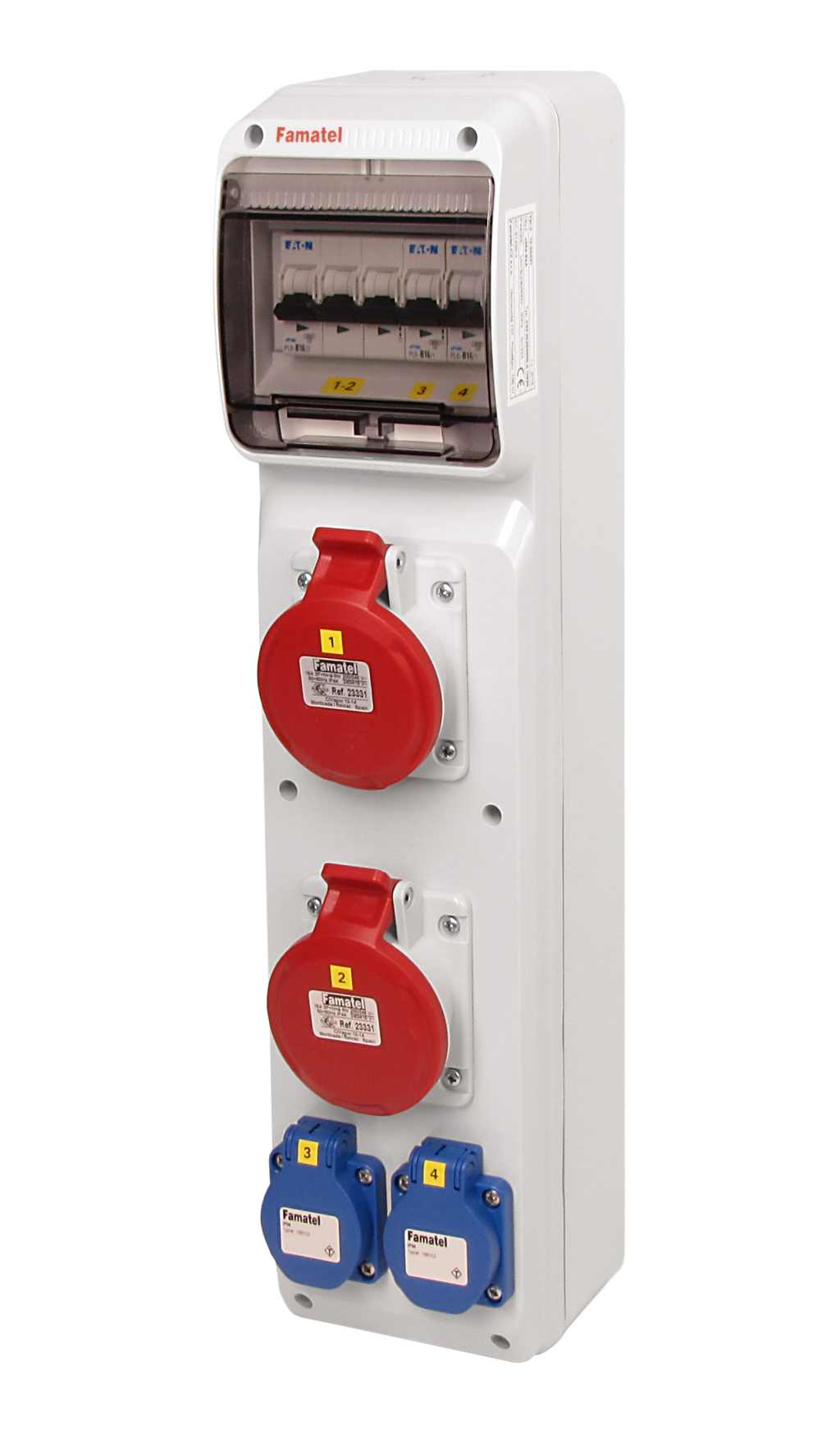 Zásuvková skříň FAMATEL v264-6kA - ZSF20200000.0 /3950 IP44 jištěná bez chrániče, zásuvky 2x230V, 2x16/5, přístroje EATON 6kA: 2xPL6-B16/1, 1xPL6-B16/3, použité pouzdro: 3950 - 490x125x107mm, barva: světle šedá.