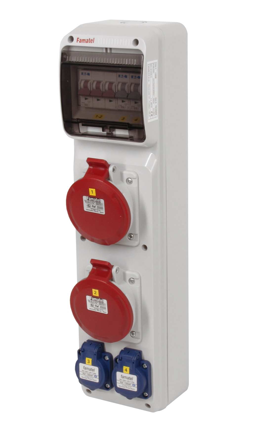 Zásuvková skříň FAMATEL v268 - ZSF20002000.0 /3950 IP44 jištěná bez chrániče, zásuvky 2x230V, 2x32/5, přístroje EATON 10kA: 2xPL7-B16/1, 1xPL7-B32/3, použité pouzdro: 3950 - 490x125x107mm, barva: světle šedá.
