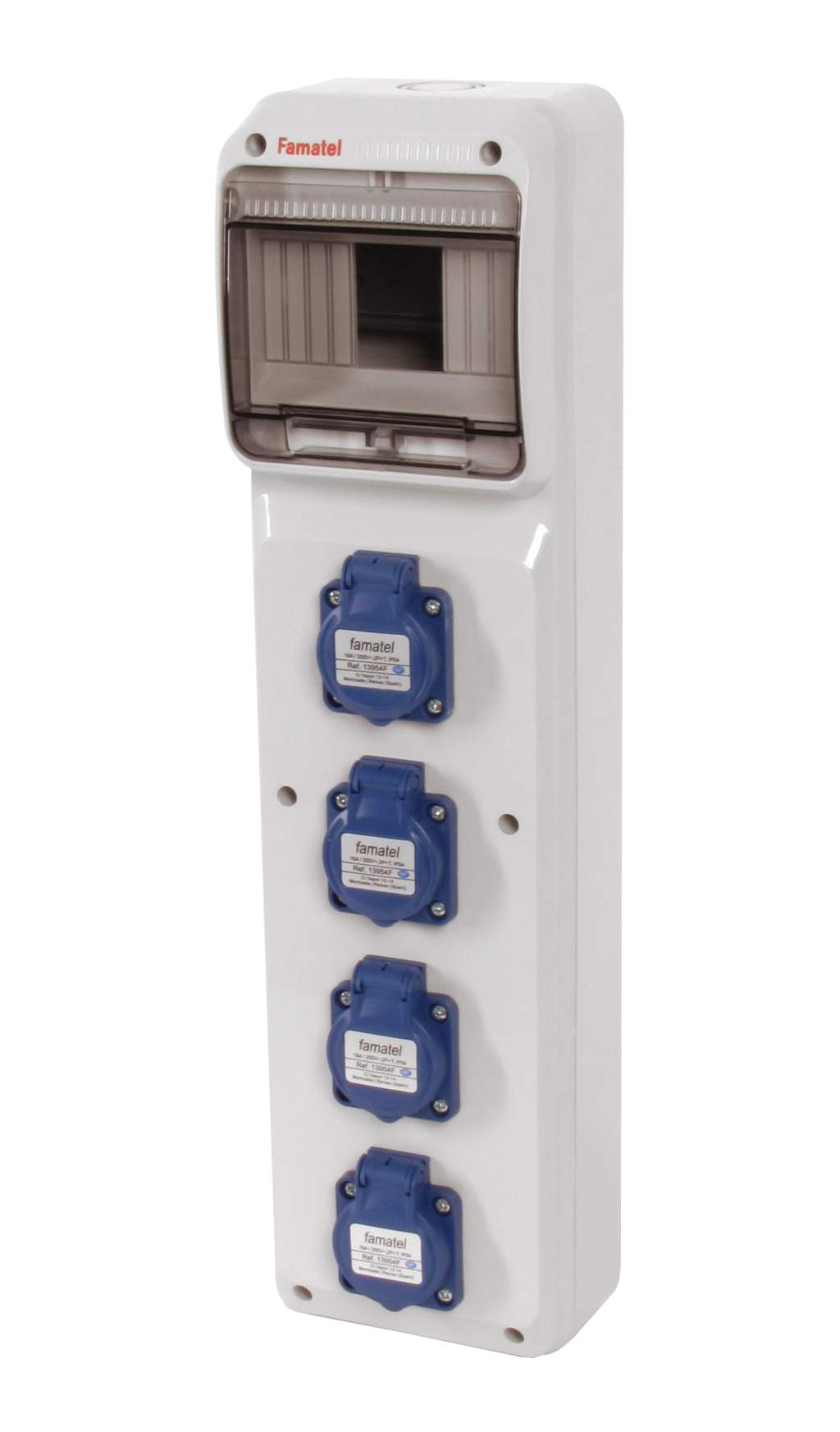 Zásuvková skříň FAMATEL v281 - ZSF40000000.V /3950 IP54 pouze vydrátovaná, zásuvky 4x230V, použité pouzdro: 3950 - 490x125x107mm, barva: světle šedá.