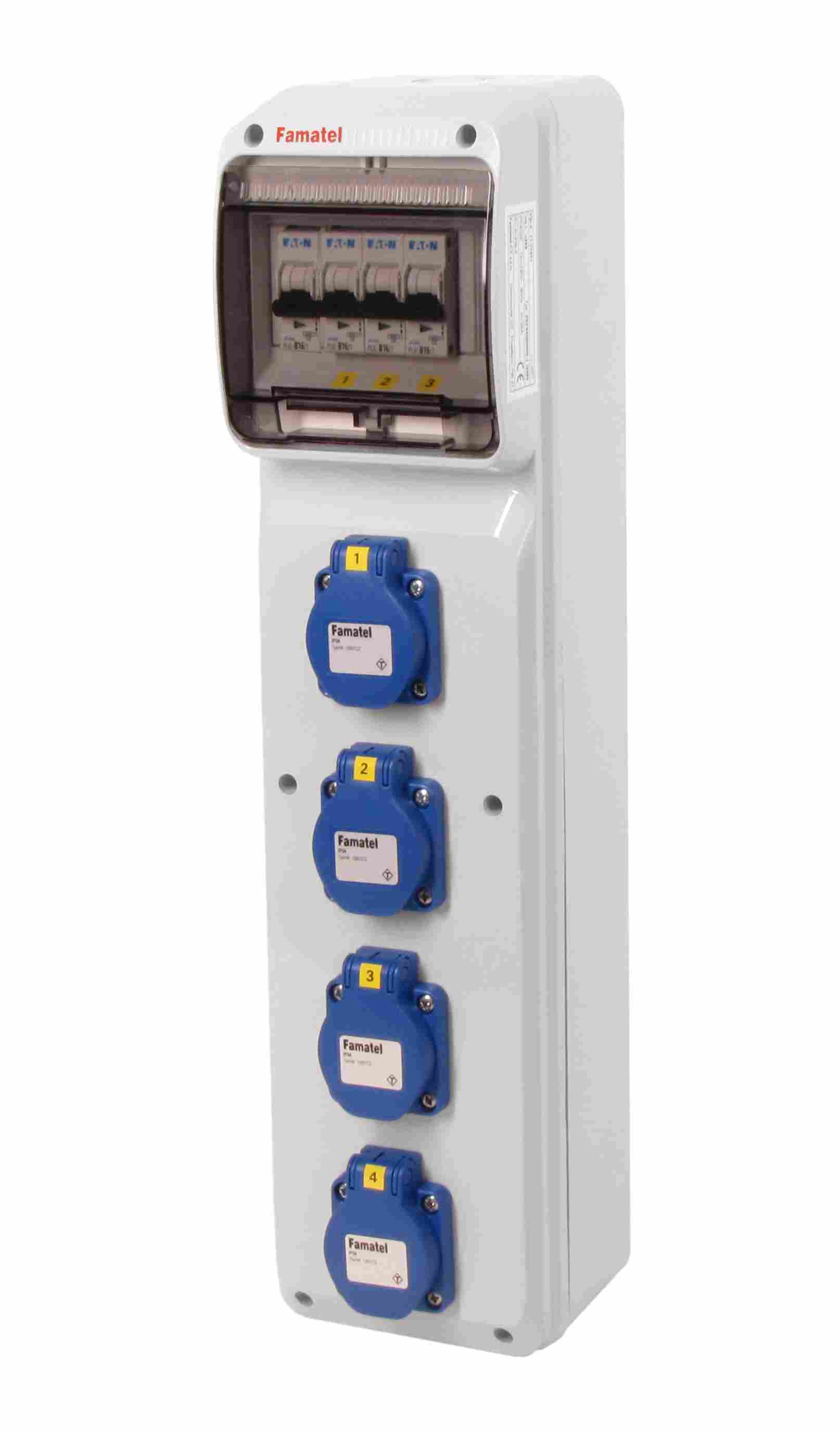 Zásuvková skříň FAMATEL v285-6kA - ZSF40000000.0 /3950 IP54 jištěná bez chrániče, zásuvky 4x230V, přístroje EATON 6kA: 4xPL6-B16/1, použité pouzdro: 3950 - 490x125x107mm, barva: světle šedá.