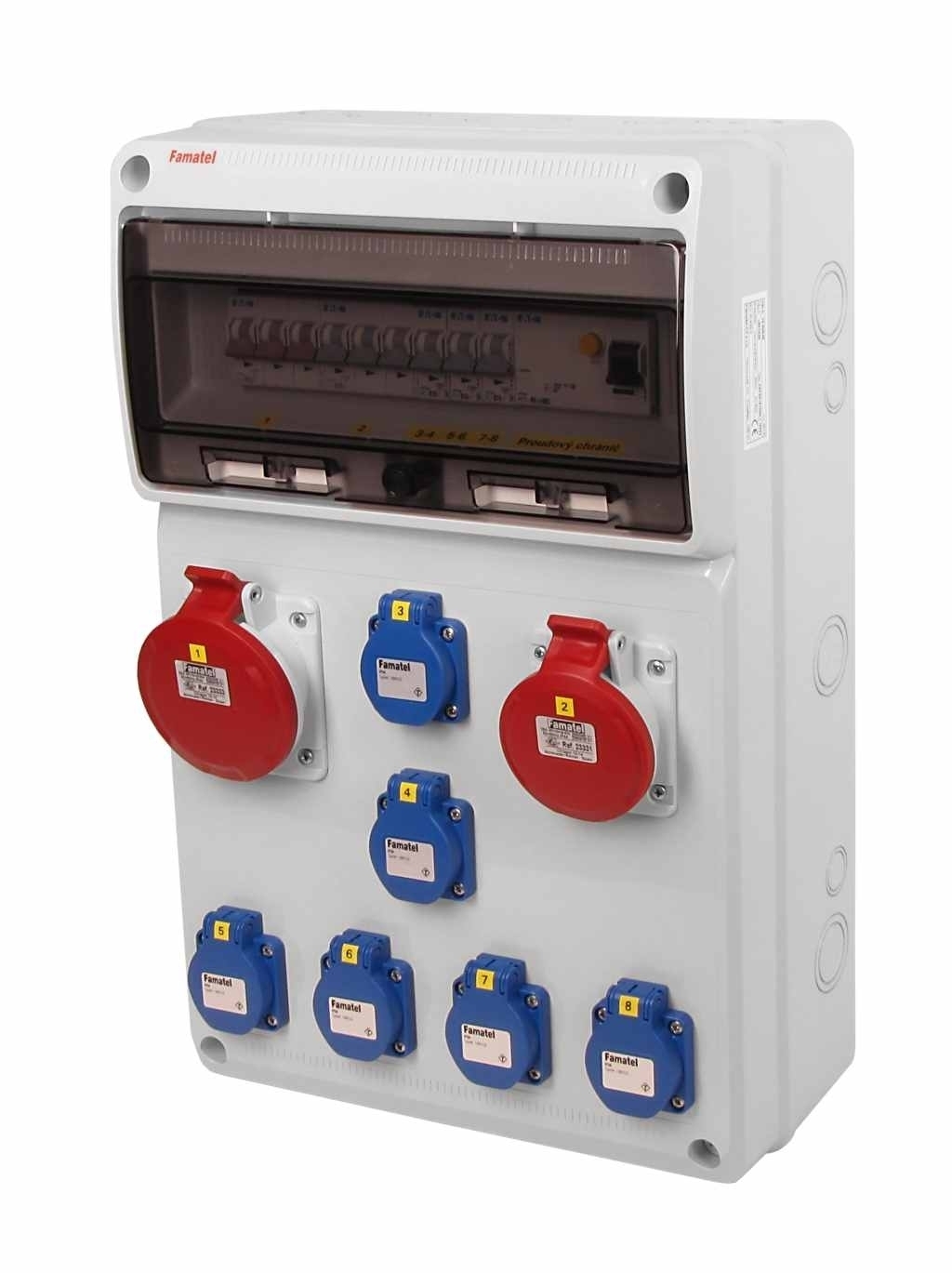 Zásuvková skříň FAMATEL v3025 - ZSF60101000.1 /3952 IP44 jištěná s chráničem 40/4/003, zásuvky 6x230V, 1x16/5, 1x32/5, přístroje EATON 10kA: 3xPL7-B16/1, 1xPL7-B16/3, 1xPL7-B32/3, PF7-40/4/003 na vstupu, použité pouzdro: 3952 - 500x330x155mm, barva: světle šedá.