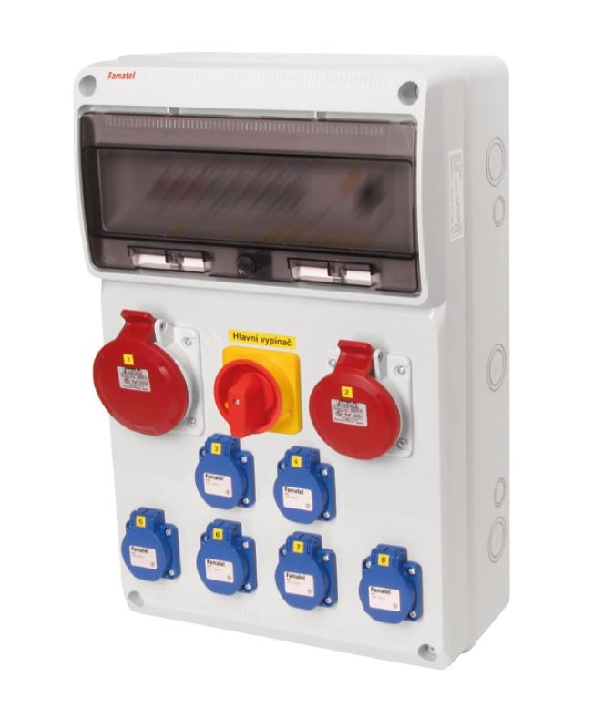 Staveništní rozváděč FAMATEL v30252-ZSFV60101000.1 /3952 IP44 jištěný s chráničem 40/4/003 a hl. vypínačem 40A určený pro montáž na omítku/zeď/povrch, zásuvky 6x230V, 1x16/5, 1x32/5, přístroje EATON 10kA: 3xPL7-B16/1, 1xPL7-B16/3, 1xPL7-B32/3, PF7-40/4/003 na vstupu, použité pouzdro: 3952 - 500x330x155mm.