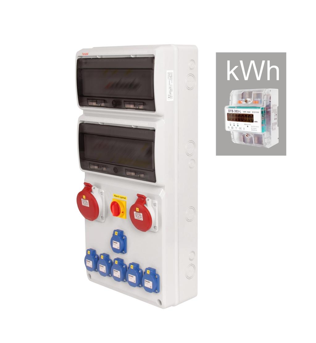 Staveništní rozváděč FAMATEL v302520-ZSFV60101000.1 /3977 IP44 jištěný s chráničem 40/4/003 a hl. vypínačem 40A, elektroměr, určený pro montáž na omítku/zeď/povrch, zásuvky 6x230V, 1x16/5, 1x32/5, přístroje EATON 10kA: 3xPL7-B16/1, 1xPL7-B16/3, 1xPL7-B32/3, PF7-40/4/003 na vstupu, použité pouzdro: 3977 - 685x330x155mm, barva: světle šedá.