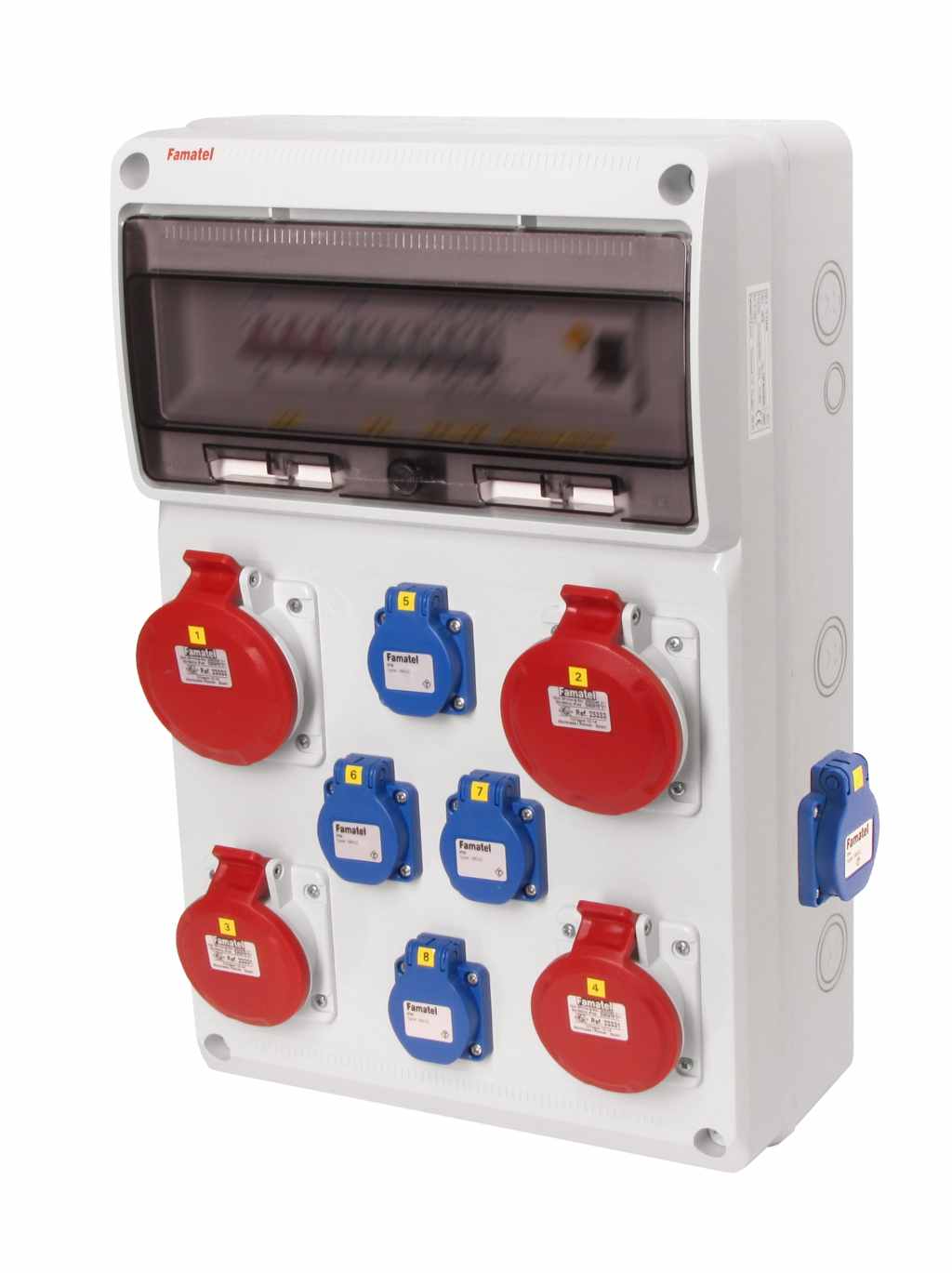 Zásuvková skříň FAMATEL v3050-6kA - ZSF60202000.1 /3952 IP44 jištěná s chráničem 40/4/003, zásuvky 6x230V, 2x16/5, 2x32/5, přístroje EATON 6kA: 3xPL6-B16/1, 1xPL6-B16/3, 1xPL6-B32/3, PF6-40/4/003 na vstupu, použité pouzdro: 3952 - 500x330x155mm, barva: světle šedá.