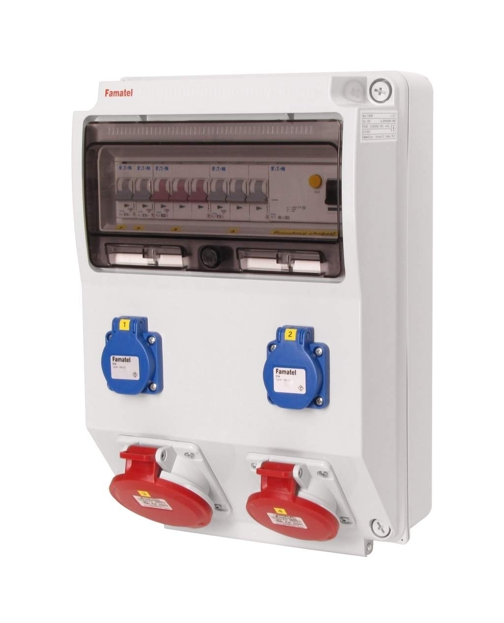 Zásuvková skříň FAMATEL v310-ZSF20101000.1 /3959 IP44 jištěná s chráničem 40/4/003, zásuvky 2x230V, 1x16/5, 1x32/5, přístroje EATON 10kA: 2xPL7-B16/1, 1xPL7-B16/3, 1xPL7-B32/3, PF7-40/4/003 na vstupu, použité pouzdro: 3959 - 398x266x153mm, barva: světle šedá.
