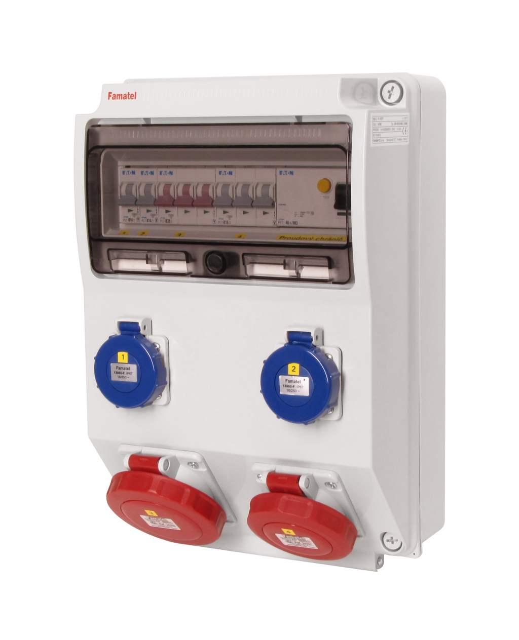 Zásuvková skříň FAMATEL v3106-ZSF20101000.1 /3959 IP65 jištěná s chráničem 40/4/003, zásuvky 2x230V, 1x16/5, 1x32/5, přístroje EATON 10kA: 2xPL7-B16/1, 1xPL7-B16/3, 1xPL7-B32/3, PF7-40/4/003 na vstupu, použité pouzdro: 3959 - 398x266x153mm, barva: světle šedá.