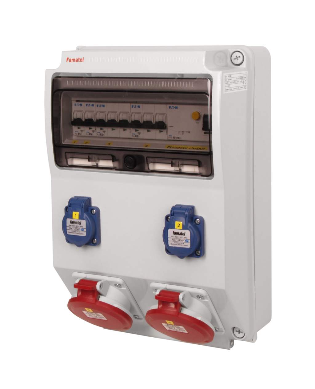 Zásuvková skříň FAMATEL v320-6kA-ZSF20002000.1 /3959 IP44 jištěná s chráničem 40/4/003, zásuvky 2x230V, 2x400V/32A, přístroje EATON 6kA: 2xPL6-B16/1, 2xPL6-B32/3, PF6-40/4/003 na vstupu, použité pouzdro: 3959 - 398x266x153mm, barva: světle šedá.