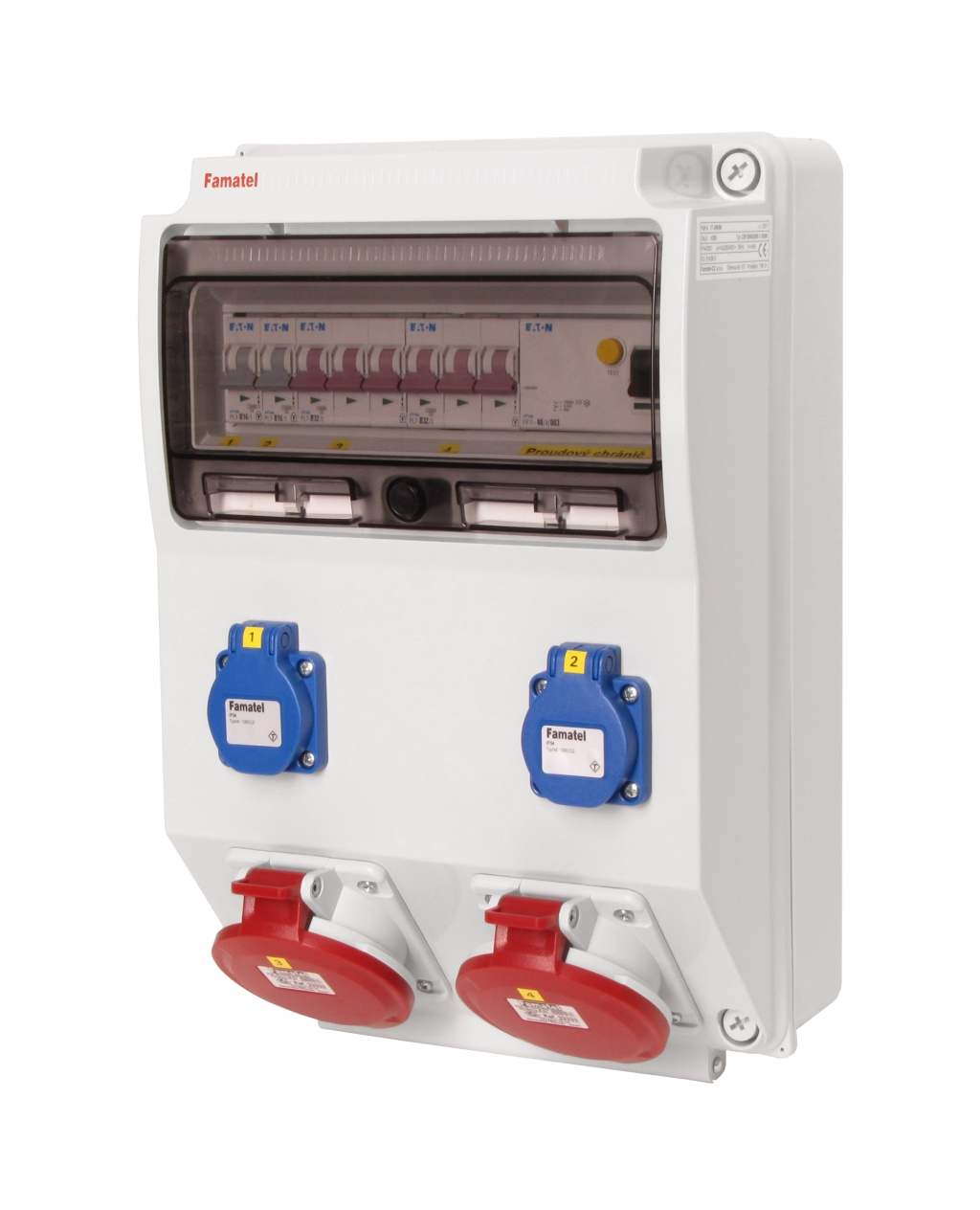 Zásuvková skříň FAMATEL v320-ZSF20002000.1 /3959 IP44 jištěná s chráničem 40/4/003, zásuvky 2x230V, 2x400V/32A, přístroje EATON 10kA: 2xPL7-B16/1, 2xPL7-B32/3, PF7-40/4/003 na vstupu, použité pouzdro: 3959 - 398x266x153mm, barva: světle šedá.