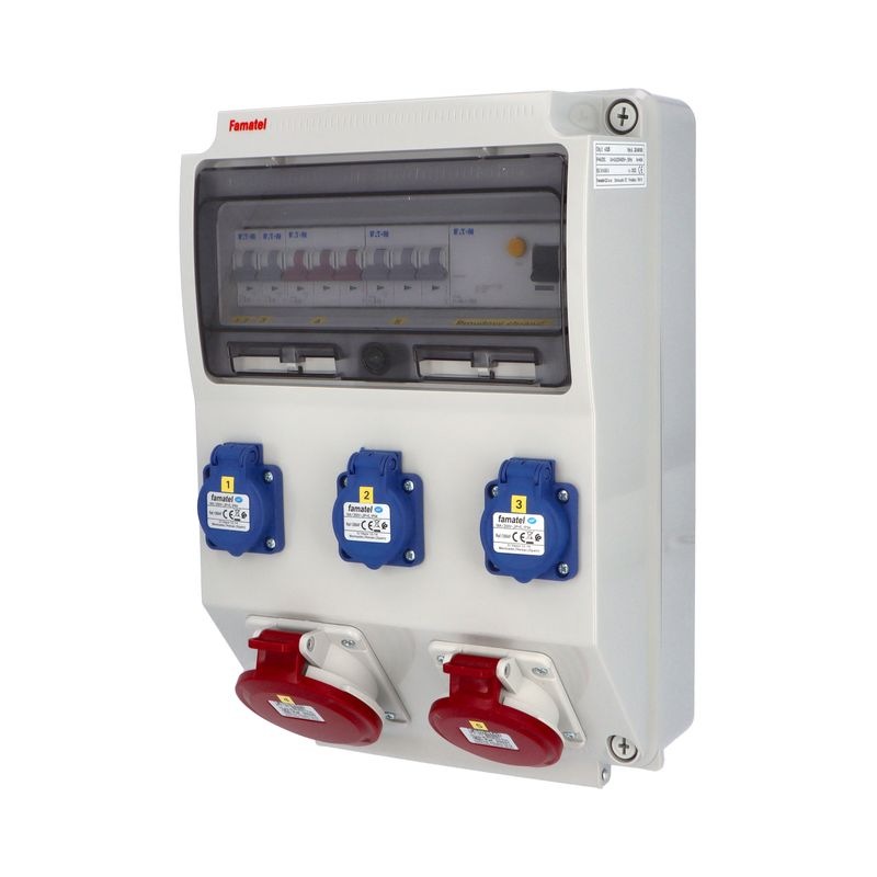 Zásuvková skříň FAMATEL v325-ZSF30101000.1 /3959 IP44 jištěná s chráničem 40/4/003, zásuvky 3x230V, 1x16/5, 1x32/5, přístroje EATON 10kA: 2xPL7-B16/1, 1xPL7-B16/3, 1xPL7-B32/3, PF7-40/4/003 na vstupu, použité pouzdro: 3959 - 398x266x153mm, barva: světle šedá.