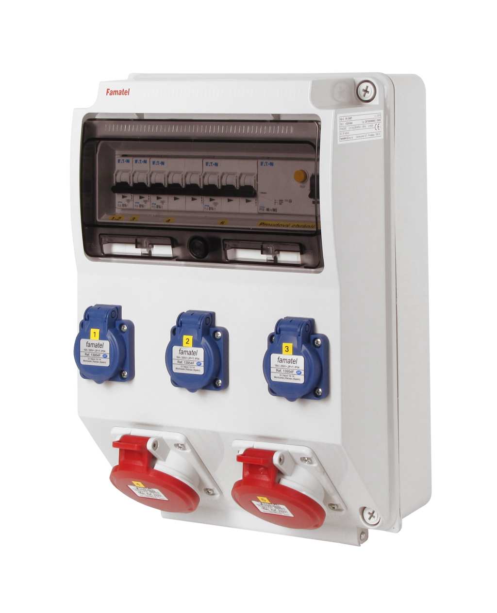 Zásuvková skříň FAMATEL v330-6kA-ZSF30200000.1 /3959 IP44 jištěná s chráničem 40/4/003, zásuvky 3x230V, 2x16/5, přístroje EATON 6kA: 2xPL6-B16/1, 2xPL6-B16/3, PF6-40/4/003 na vstupu, použité pouzdro: 3959 - 398x266x153mm, barva: světle šedá.