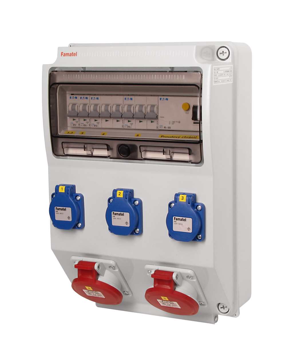 Zásuvková skříň FAMATEL v330-ZSF30200000.1 /3959 IP44 jištěná s chráničem 40/4/003, zásuvky 3x230V, 2x16/5, přístroje EATON 10kA: 2xPL7-B16/1, 2xPL7-B16/3, PF7-40/4/003 na vstupu, použité pouzdro: 3959 - 398x266x153mm, barva: světle šedá.