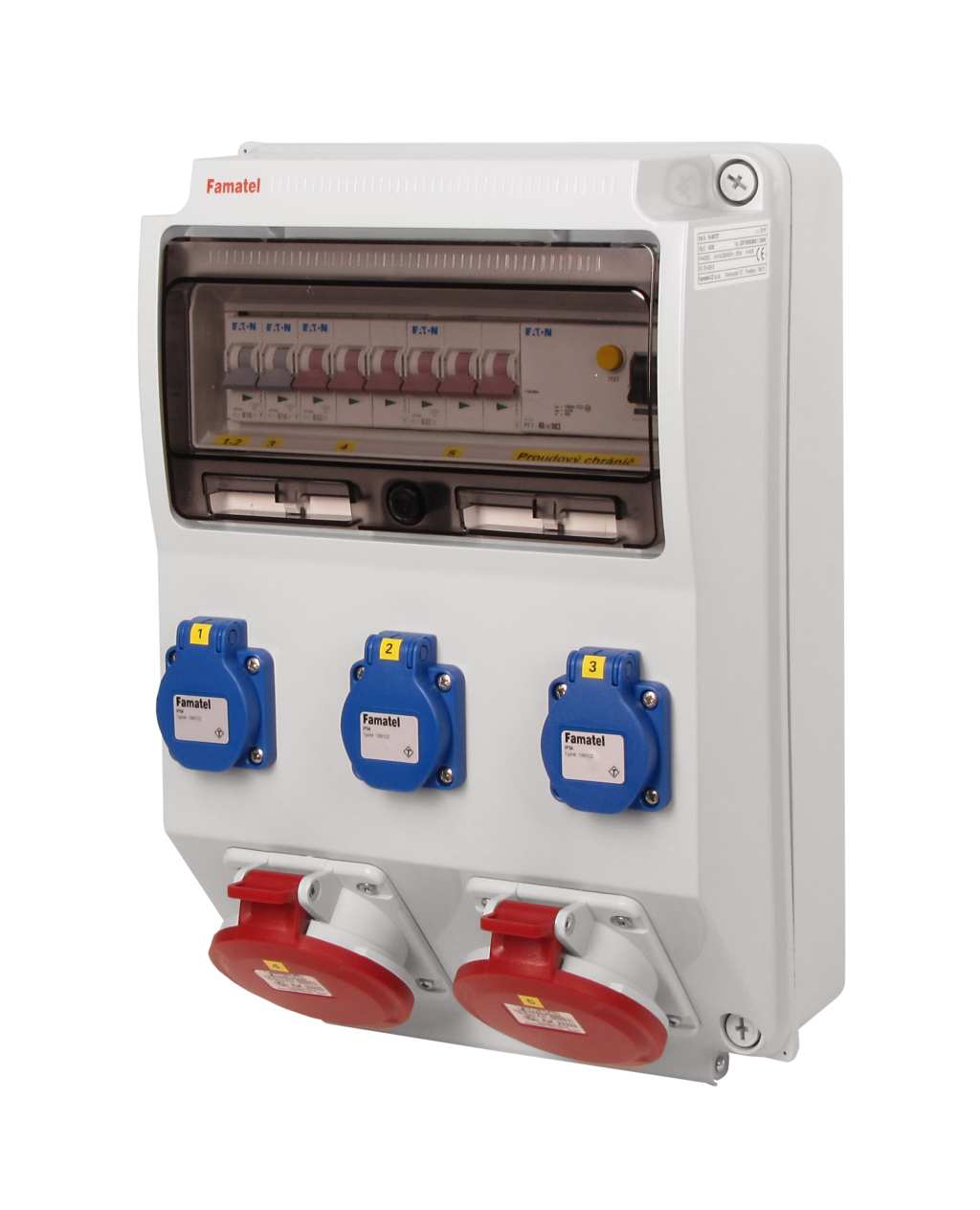 Zásuvková skříň FAMATEL v335-ZSF30002000.1 /3959 IP44 jištěná s chráničem 40/4/003, zásuvky 3x230V, 2x32/5, přístroje EATON 10kA: 2xPL7-B16/1, 2xPL7-B32/3, PF7-40/4/003 na vstupu, použité pouzdro: 3959 - 398x266x153mm, barva: světle šedá.