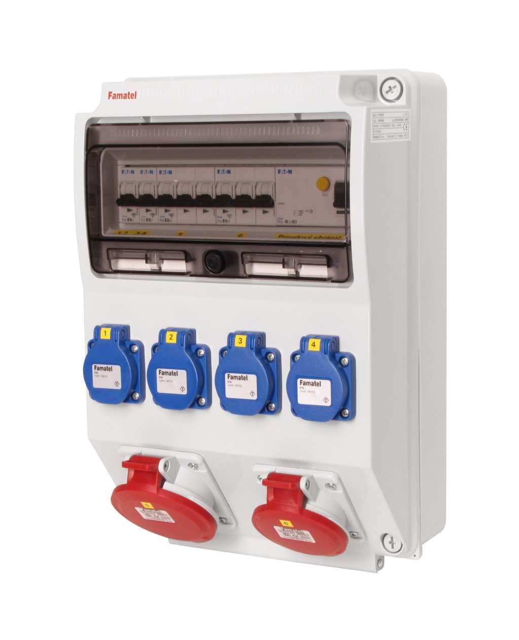 Zásuvková skříň FAMATEL v340-6kA-ZSF40101000.1 /3959 IP44 jištěná s chráničem 40/4/003, zásuvky 4x230V, 1x16/5, 1x32/5, přístroje EATON 6kA: 2xPL6-B16/1, 1xPL6-B16/3, 1xPL6-B32/3, PF6-40/4/003 na vstupu, použité pouzdro: 3959 - 398x266x153mm, barva: světle šedá.