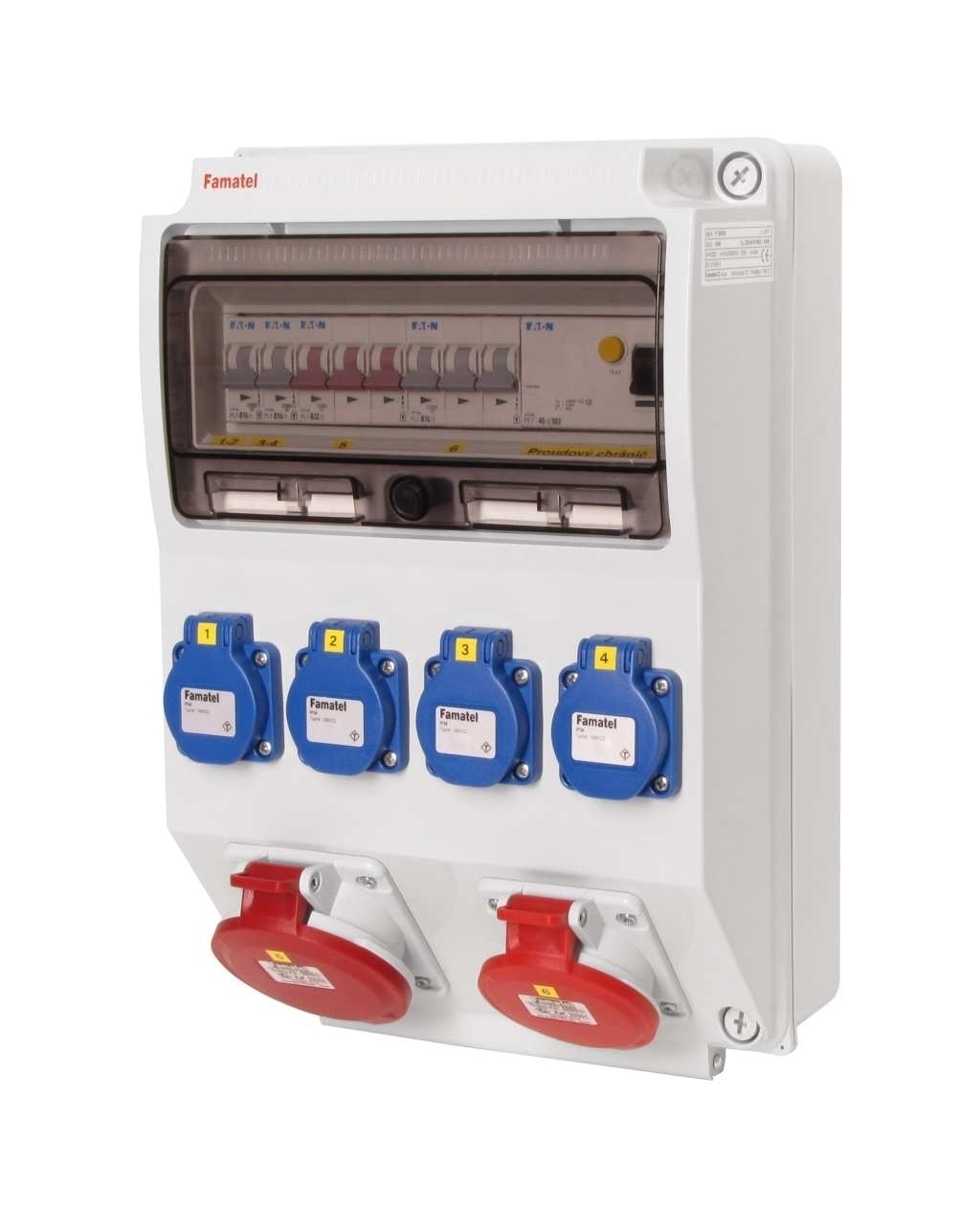 Zásuvková skříň FAMATEL v340-ZSF40101000.1 /3959 IP44 jištěná s chráničem 40/4/003, zásuvky 4x230V, 1x16/5, 1x32/5, přístroje EATON 10kA: 2xPL7-B16/1, 1xPL7-B16/3, 1xPL7-B32/3, PF7-40/4/003 na vstupu, použité pouzdro: 3959 - 398x266x153mm, barva: světle šedá.