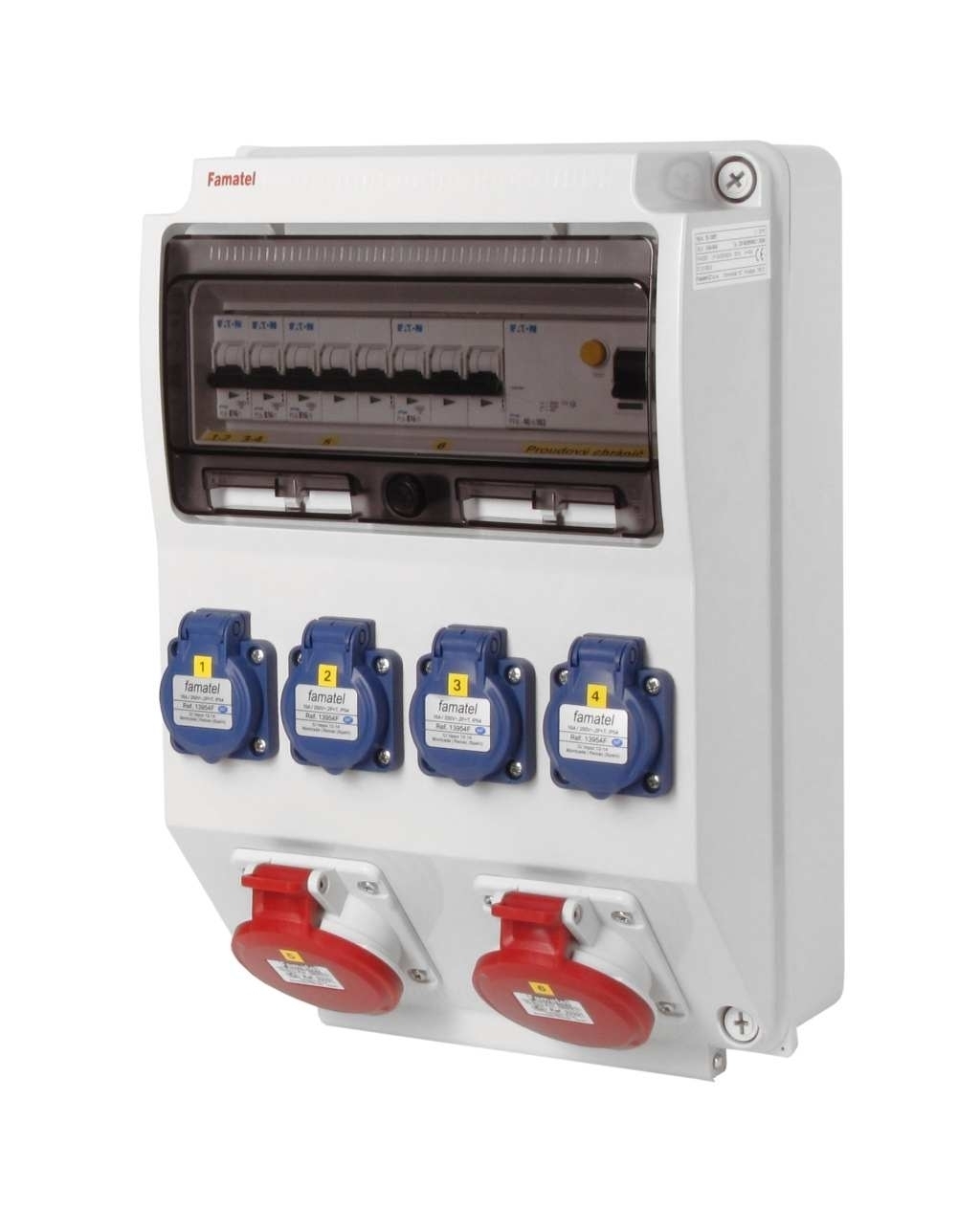 Zásuvková skříň FAMATEL v344-6kA-ZSF40200000.1 /3959 IP44 jištěná s chráničem 40/4/003, zásuvky 4x230V, 2x16/5, přístroje EATON 6kA: 2xPL6-B16/1, 2xPL6-B16/3, PF6-40/4/003 na vstupu, použité pouzdro: 3959 - 398x266x153mm, barva: světle šedá.