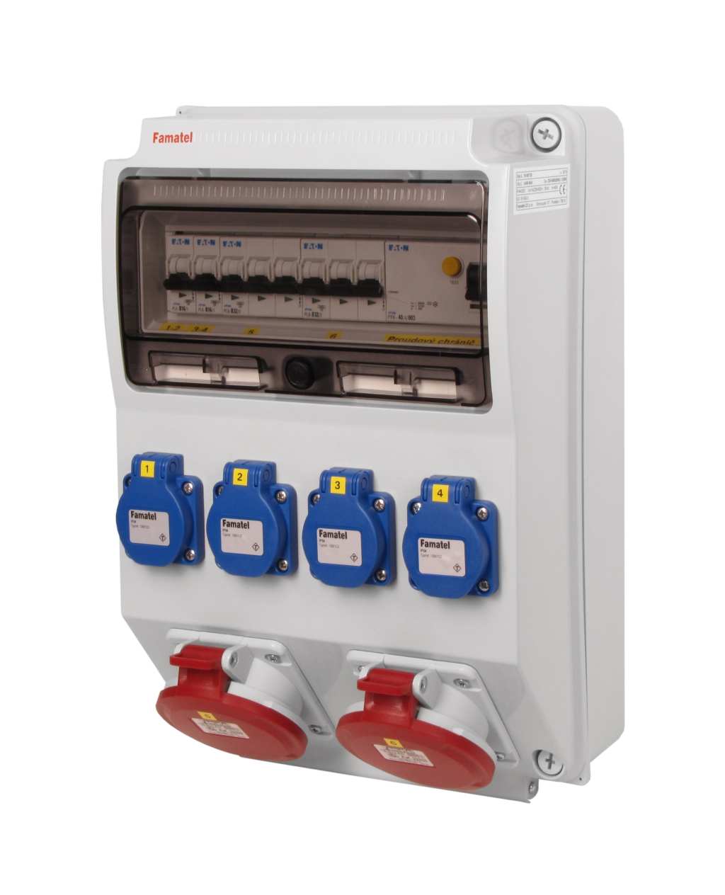Zásuvková skříň FAMATEL v348-6kA-ZSF40002000.1 /3959 IP44 jištěná s chráničem 40/4/003, zásuvky 4x230V, 2x32/5, přístroje EATON 6kA: 2xPL6-B16/1, 2xPL6-B32/3, PF6-40/4/003 na vstupu, použité pouzdro: 3959 - 398x266x153mm, barva: světle šedá.