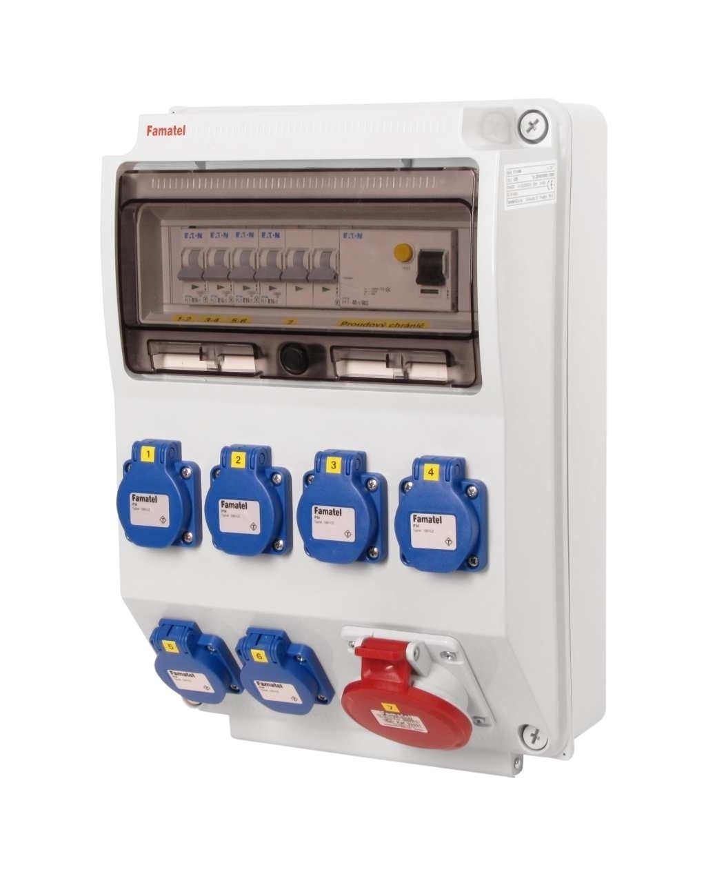 Zásuvková skříň FAMATEL v350-ZSF60100000.1 /3959 IP44 jištěná s chráničem 40/4/003, zásuvky 6x230V, 1x16/5, přístroje EATON 10kA: 3xPL7-B16/1, 1xPL7-B16/3, PF7-40/4/003 na vstupu, použité pouzdro: 3959 - 398x266x153mm, barva: světle šedá.