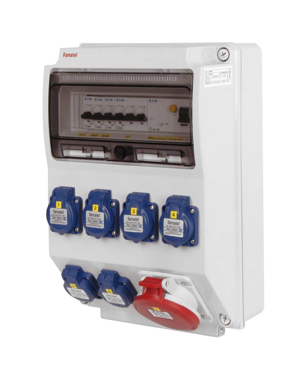 Zásuvková skříň FAMATEL v352-6kA-ZSF60001000.1 /3959 IP44 jištěná s chráničem 40/4/003, zásuvky 6x230V, 1x32/5, přístroje EATON 6kA: 3xPL6-B16/1, 1xPL6-B32/3, PF6-40/4/003 na vstupu, použité pouzdro: 3959 - 398x266x153mm, barva: světle šedá.