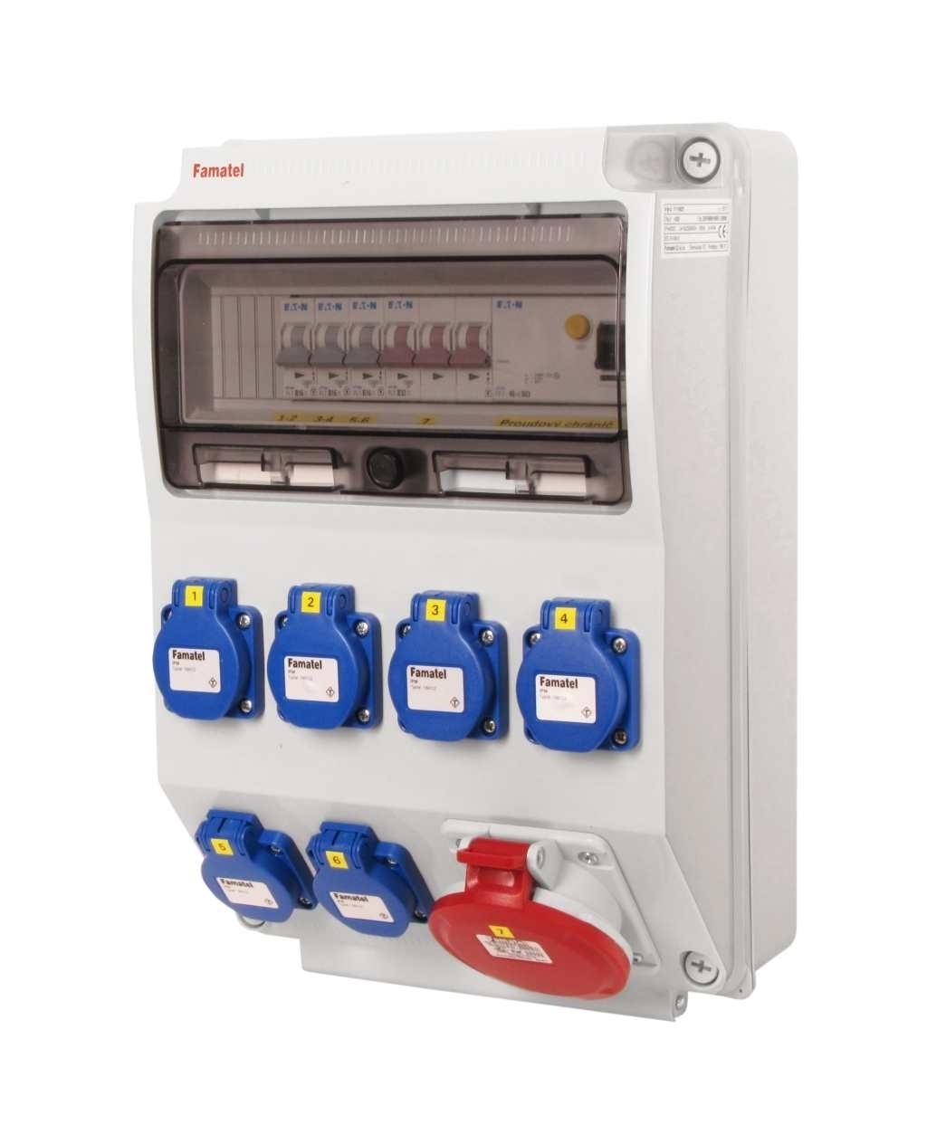Zásuvková skříň FAMATEL v352-ZSF60001000.1 /3959 IP44 jištěná s chráničem 40/4/003, zásuvky 6x230V, 1x32/5, přístroje EATON 10kA: 3xPL7-B16/1, 1xPL7-B32/3, PF7-40/4/003 na vstupu, použité pouzdro: 3959 - 398x266x153mm, barva: světle šedá.