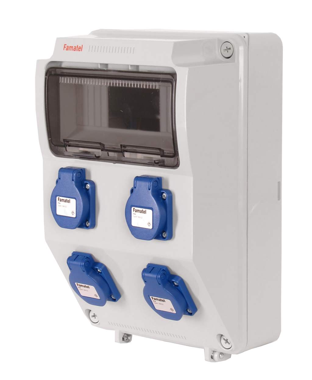 Zásuvková skříň FAMATEL v355 - ZSF40000000.V /3958 IP44 pouze vydrátovaná, zásuvky 4x230V, použité pouzdro: 3958 - 330x215x155mm, barva: světle šedá.