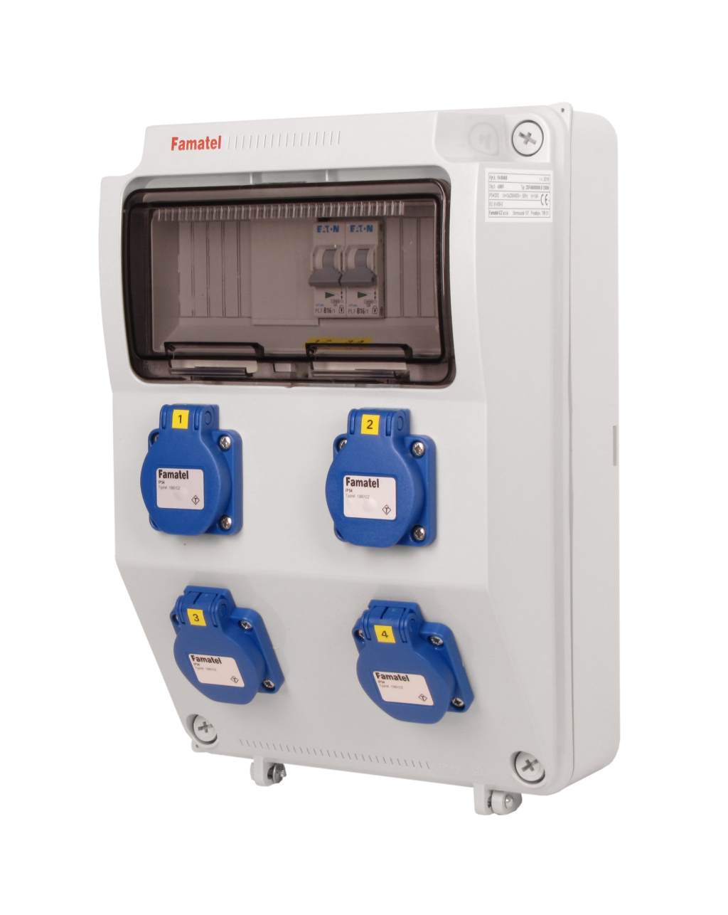 Zásuvková skříň FAMATEL v3601 - ZSF40000000.0 /3958 IP54 jištěná bez chrániče, zásuvky 4x230V, přístroje EATON 10kA: 2xPL7-B16/1, použité pouzdro: 3958 - 330x215x155mm, barva: světle šedá.