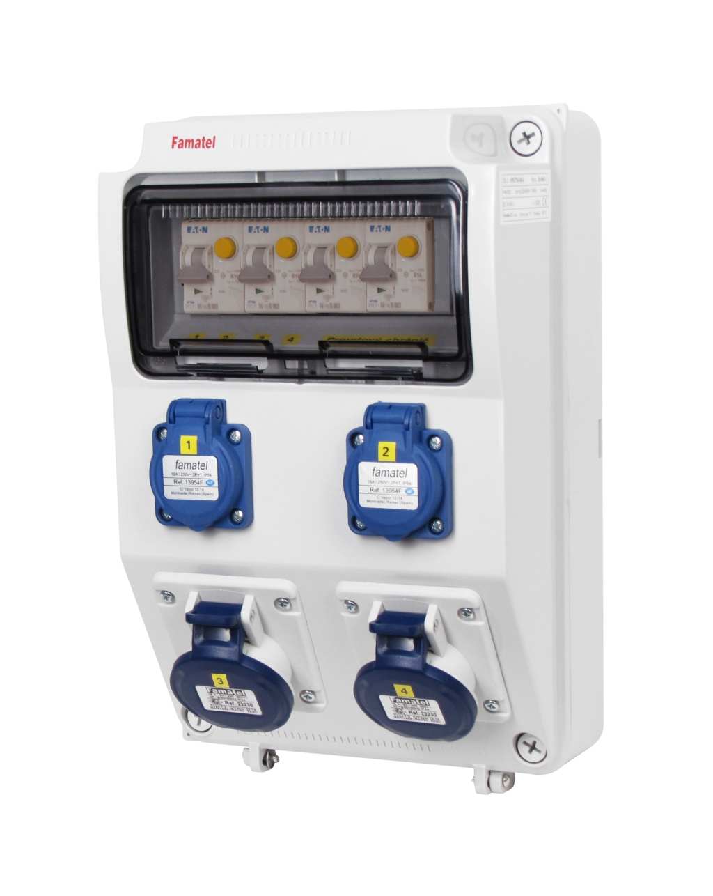 Zásuvková skříň FAMATEL v364-ZSF40000000.1 /3958 IP44 jištěná kombi chrániči 4x16/1N/B/003, zásuvky 2x230V, 2x230V CEE, přístroje EATON 10kA: 4xPFL7-16/1N/B/003, použité pouzdro: 3958 - 330x215x155mm, barva: světle šedá.
