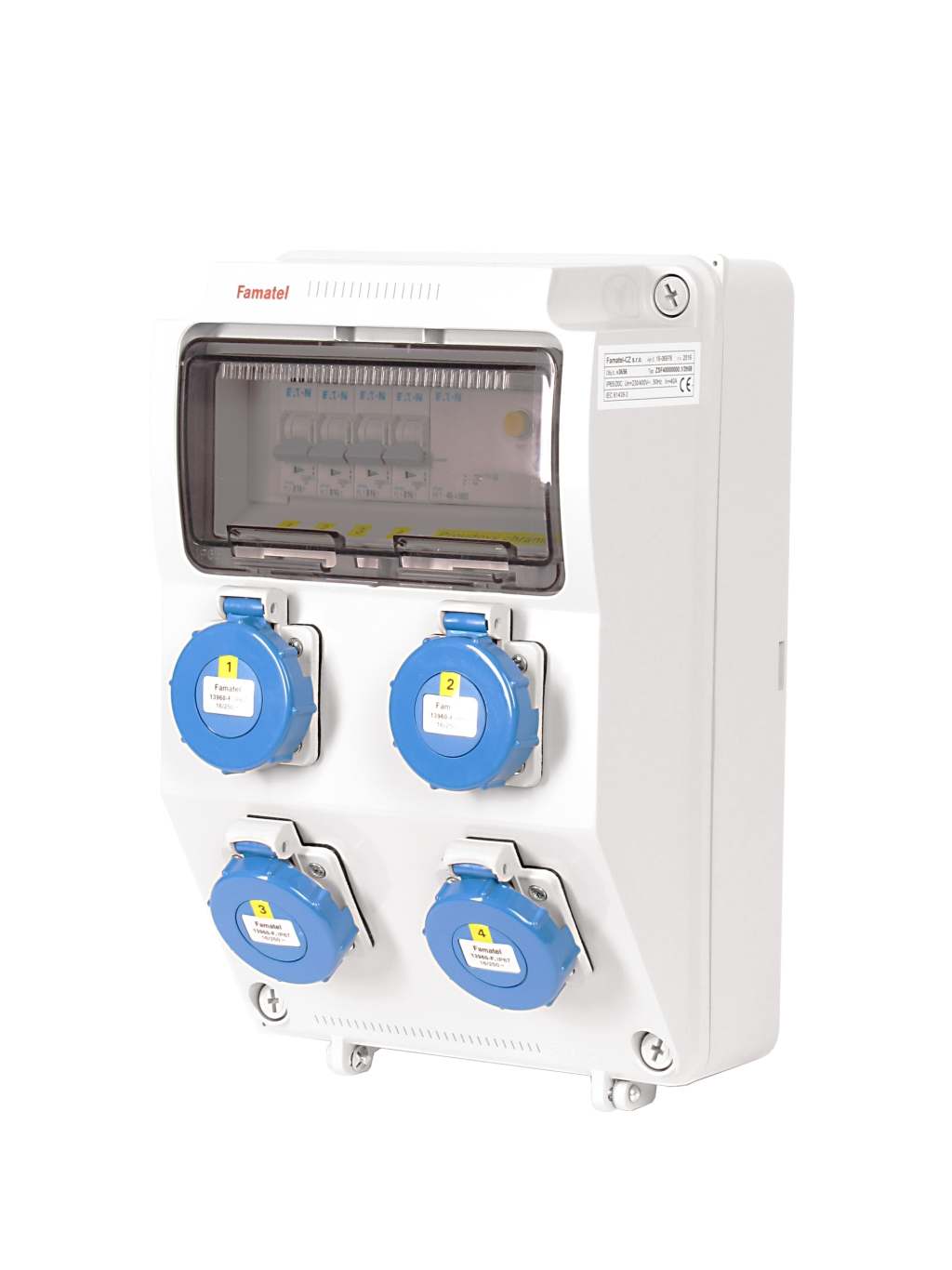 Zásuvková skříň FAMATEL v3656 - ZSF40000000.1 /3958 IP65 jištěná s chráničem 40/4/003, zásuvky 4x230V, přístroje EATON 10kA: 4xPL7-B16/1, PF7-40/4/003 na vstupu, použité pouzdro: 3958 - 330x215x155mm, barva: světle šedá.