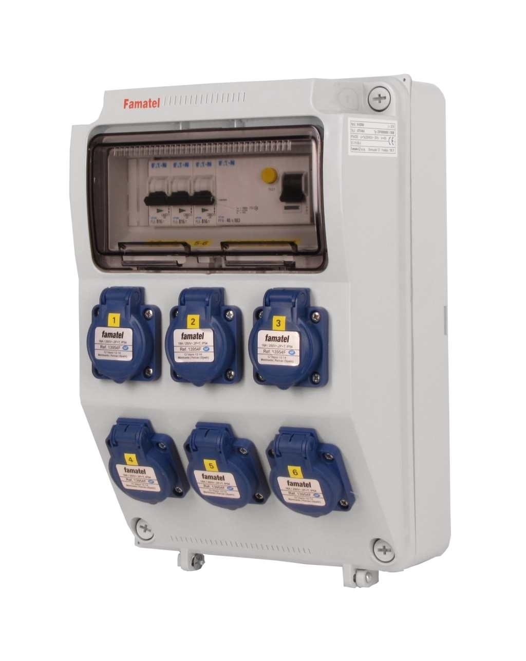 Zásuvková skříň FAMATEL v375-6kA-ZSF60000000.1 /3958 IP54 jištěná s chráničem 40/4/003, zásuvky 6x230V, přístroje EATON 6kA: 3xPL6-B16/1, na vstupu PF6-40/4/003, použité pouzdro: 3958 - 330x215x155mm, barva: světle šedá.