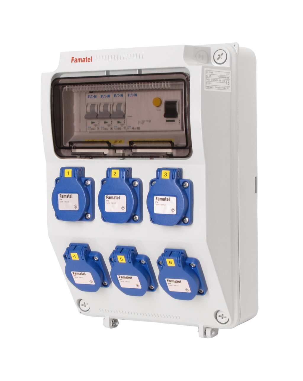 Zásuvková skříň FAMATEL v375-ZSF60000000.1 /3958 IP54 jištěná s chráničem 40/4/003, zásuvky 6x230V, přístroje EATON 10kA: 3xPL7-B16/1, na vstupu PF7-40/4/003, použité pouzdro: 3958 - 330x215x155mm, barva: světle šedá.