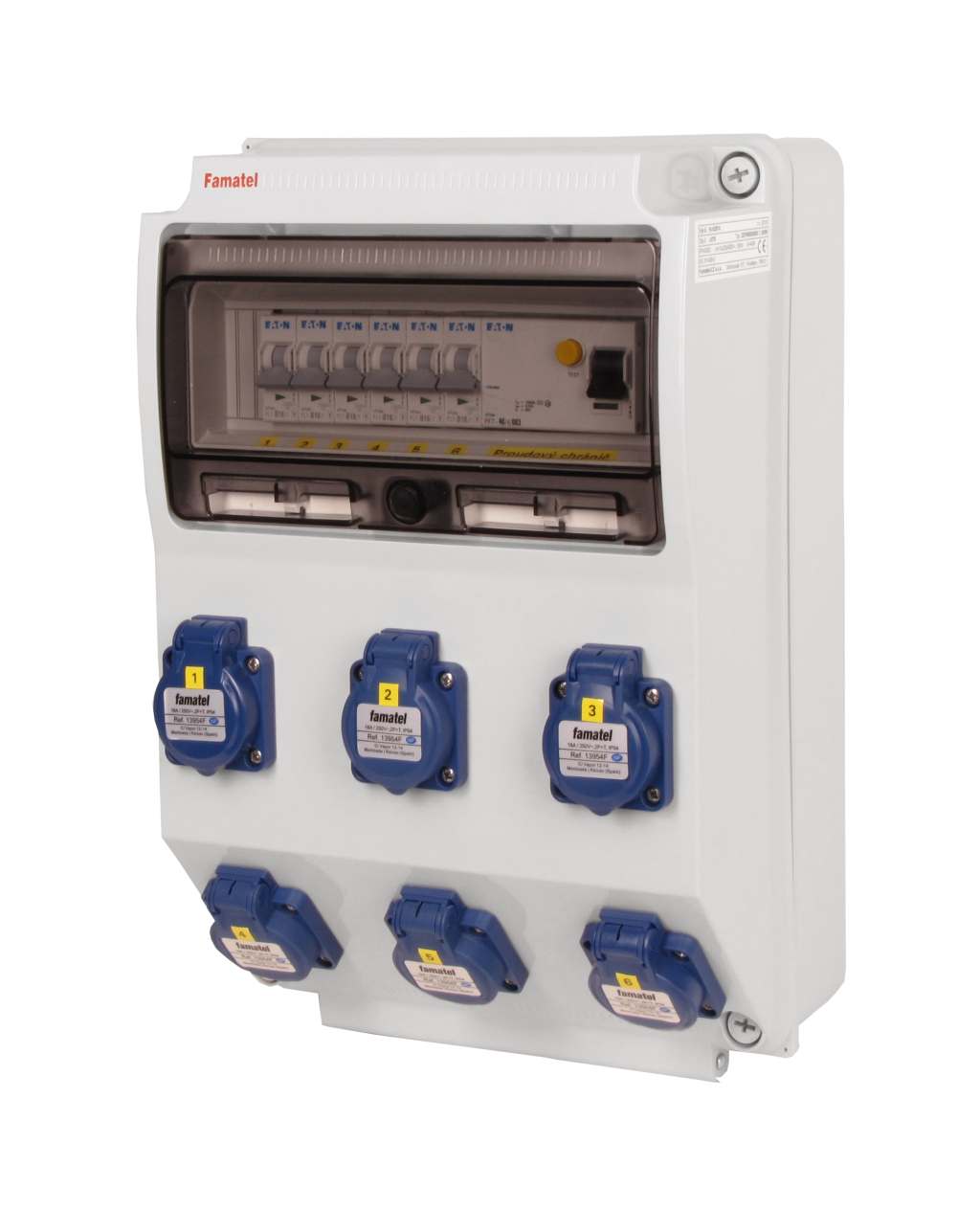 Zásuvková skříň FAMATEL v379-ZSF60000000.1 /3959 IP44 jištěná s chráničem 40/4/003, zásuvky 6x230V, přístroje EATON 10kA: 6xPL7-B16/1, PF7-40/4/003 na vstupu, použité pouzdro: 3959 - 398x266x153mm, barva: světle šedá.