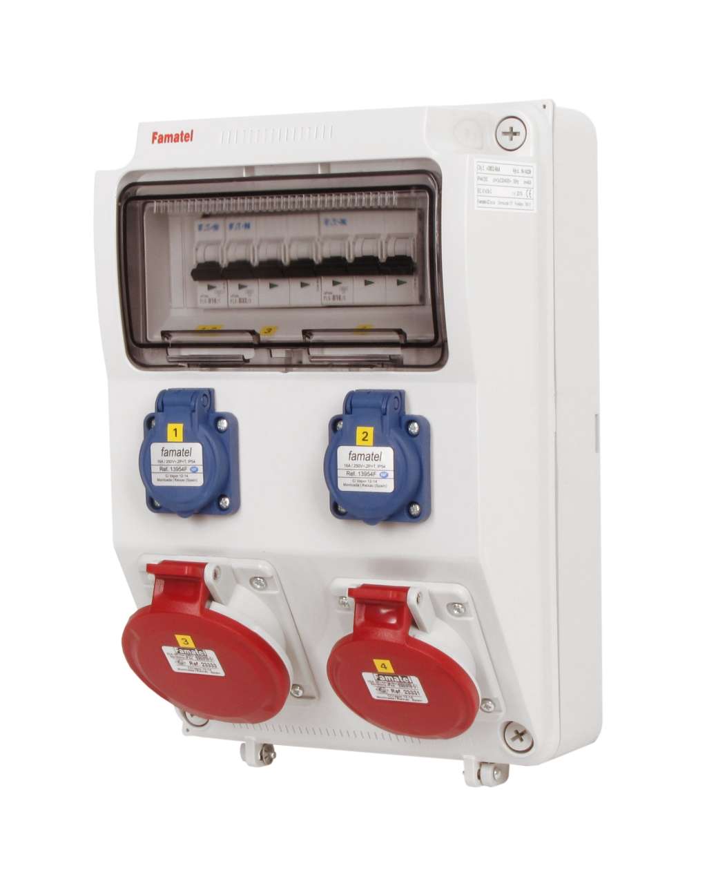 Zásuvková skříň FAMATEL v3852-6kA - ZSF20101000.0 /3958 IP44 jištěná bez chrániče, zásuvky 2x230V, 1x16/5, 1x32/5, přístroje EATON 6kA: 1xPL6-B16/1, 1xPL6-B16/3, 1xPL6-B32/3, použité pouzdro: 3958 - 330x215x155mm, barva: světle šedá.