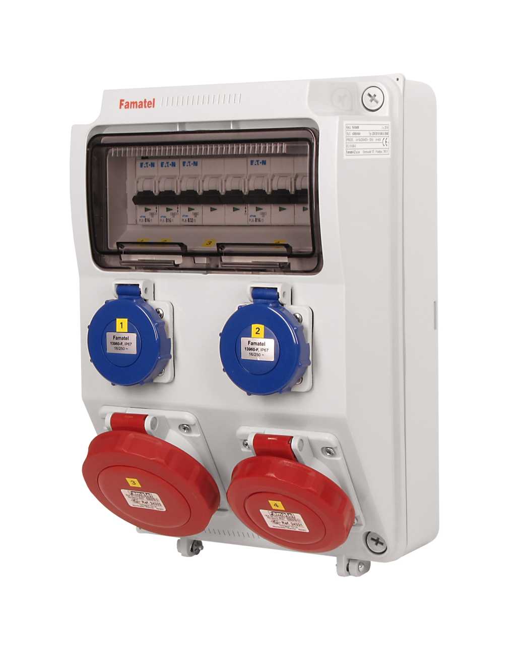 Zásuvková skříň FAMATEL v3856-6kA - ZSF20101000.0 /3958 IP65 jištěná bez chrániče, zásuvky 2x230V, 1x16/5, 1x32/5, přístroje EATON 6kA: 2xPL6-B16/1, 1xPL6-B16/3, 1xPL6-B32/3, použité pouzdro: 3958 - 330x215x155mm, barva: světle šedá.