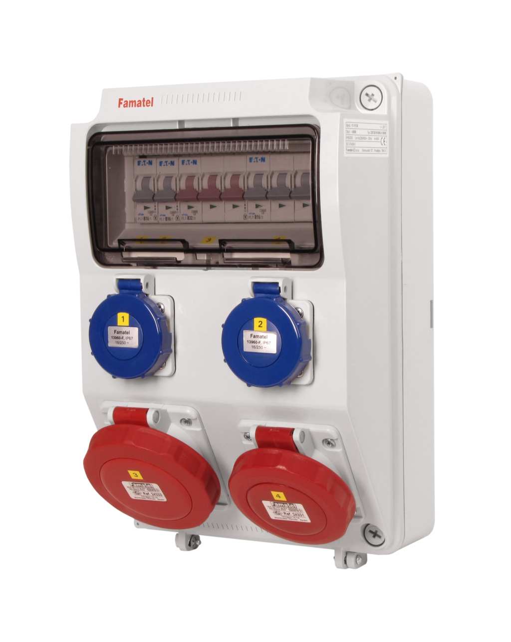 Zásuvková skříň FAMATEL v3856 - ZSF20101000.0 /3958 IP65 jištěná bez chrániče, zásuvky 2x230V, 1x16/5, 1x32/5, přístroje EATON 10kA: 2xPL7-B16/1, 1xPL7-B16/3, 1xPL7-B32/3, použité pouzdro: 3958 - 330x215x155mm, barva: světle šedá.