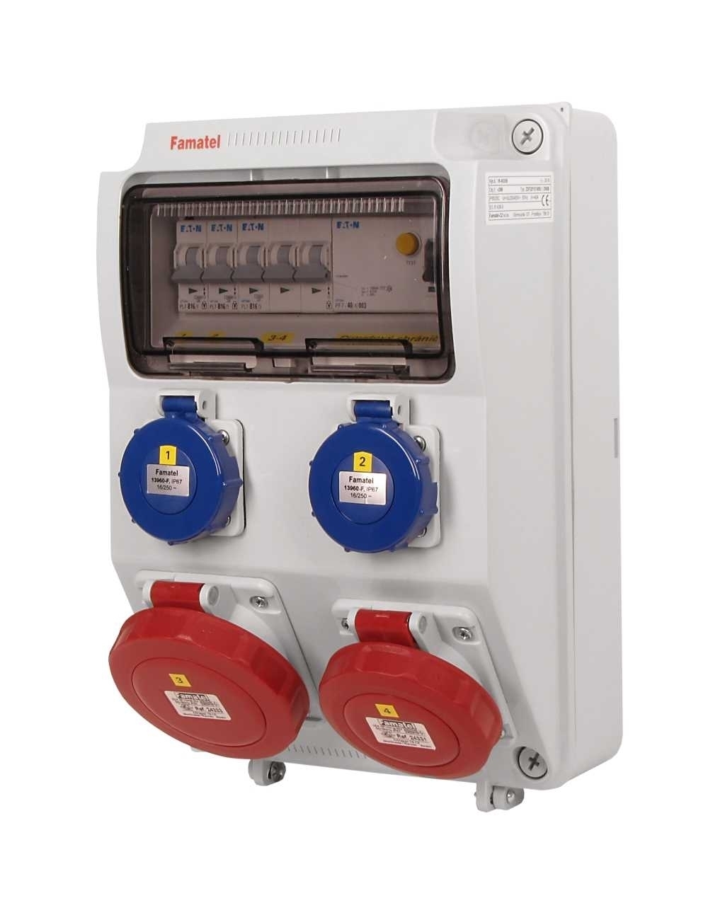Zásuvková skříň FAMATEL v396 - ZSF20101000.1 /3958 IP65 jištěná s chráničem 40/4/003 (ekonomická varianta), zásuvky 2x230V, 1x16/5, 1x32/5, přístroje EATON 10kA: 2xPL7-B16/1, 1xPL7-B16/3 (společný pro 16/5 a 32/5), PF7- 40/4/003 na vstupu, použité pouzdro: 3958 - 330x215x155mm, barva: světle šedá.