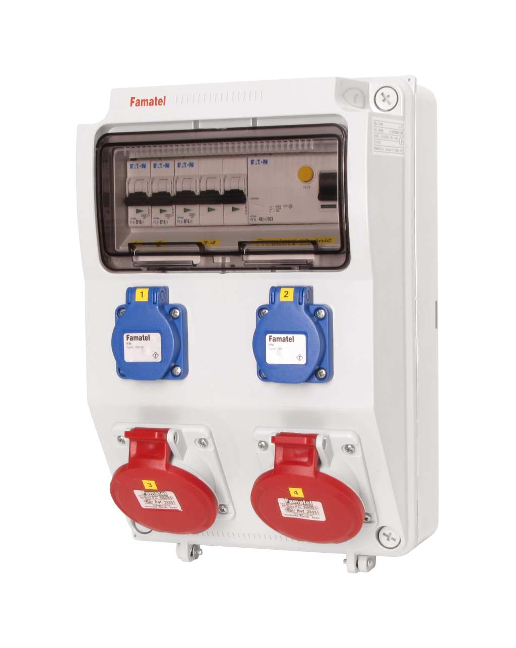Zásuvková skříň FAMATEL v410-6kA-ZSF20200000.1 /3958 IP44 jištěná s chráničem 40/4/003, zásuvky 2x230V, 2x16/5, přístroje EATON 6kA: 2xPL6-B16/1, 1xPL6-B16/3, PF6-40/4/003 na vstupu, použité pouzdro: 3958 - 330x215x155mm, barva: světle šedá.